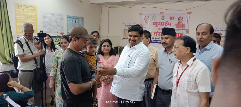 जिला चिकित्सालय दुर्ग में आज दुर्ग शहर के विधायक गजेन्द्र यादव ने शिशु को आईएफए एवं विटामिन ए का सिरप पिलाकर शिशु संरक्षण माह शुभारंभ किये, उन्होंने उपस्थित माताओ को शिशओ के उचित देखभाल करने प्रेरित किये साथ ही स्वयं के खान पान पर ध्यान देने तथा चिकित्सको के अनुसार समय समय पर शिशुओ को टिकाकरण कराने कहा ताकि जच्चा बच्चा स्वस्थ रहे। जिला स्तर पर कार्यक्रम के शुभारंभ अवसर पर मुख्य चिकित्सा एवं स्वास्थ्य अधिकारी डॉ. मनोज दानी, सिविल सर्जन डॉ. एच. के. साहू, जिला टीकाकरण अधिकारी डॉ. दिव्या श्रीवास्तव, जिला कार्यक्रम प्रबंधक संदीप ताम्रकार, शिशु रोग विशेषज्ञ डॉ. सीमा जैन, हास्पिटल कंसल्टेंट, आरएमएनसीएच ए कंसल्टेंट एवं अन्य जिला स्तर के अधिकारी / कर्मचारी उपस्थित थे।