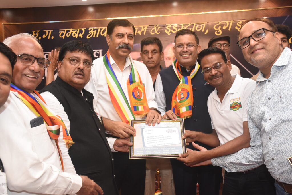 छत्तीसगढ़ कॉमर्स एण्ड इंडस्ट्रीज के दुर्ग जिला इकाई द्वारा शिवनाथ नदी रोड स्थित आनंद मंगलम में आयोजित चेम्बर सम्मेलन में जिलेभर से व्यापारी जुटे। सम्मेलन में व्यापारियों ने चेम्बर के 3 वर्षों के कार्यकाल की सराहना करते हुए व्यापारिक एवं व्यापारी हित में अपनी प्रतिबद्धता व्यक्त की गई। इस अवसर पर मुख्य अतिथि चेम्बर प्रदेश अध्यक्ष अमर परवानी,विशेष अतिथि पुलिस अधीक्षक जितेन्द्र शुक्ला,चेम्बर प्रदेश महामंत्री अजय भसीन,कोषाध्यक्ष गार्गीशंकर मिश्रा व अन्य अतिथियों द्वारा उत्कृष्ट कार्यों के लिए व्यापारियों का सम्मान कर उनका हौसला बढ़ाया गया।