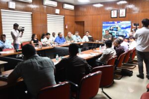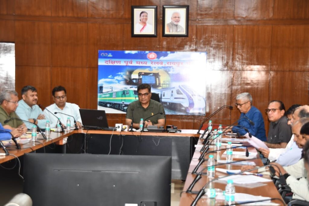 प्रेसवार्ता के दौरान दक्षिण पूर्व मध्य रेलवे रायपुर मंडल सभागार में मंडल रेल प्रबंधक श्री संजीव कुमार, वरिष्ठ मंडल वाणिज्य प्रबंधक श्री अवधेश त्रिवेदी, प्रेस इनफार्मेशन ब्यूरो (पीआईबी) के उपनिदेशक श्री रमेश गजबिये एवं मंडल के अन्य अधिकारी,रायपुर (छत्तीसगढ़) मीडिया के सम्माननीय प्रतिनिधिगण उपस्थित थे ।