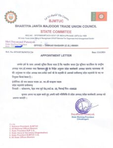मजदूरों के प्रति कर्तव्य भावना को देखते हुए इन्हें छत्तीसगढ़ प्रदेश का महामंत्री नियुक्त किया…