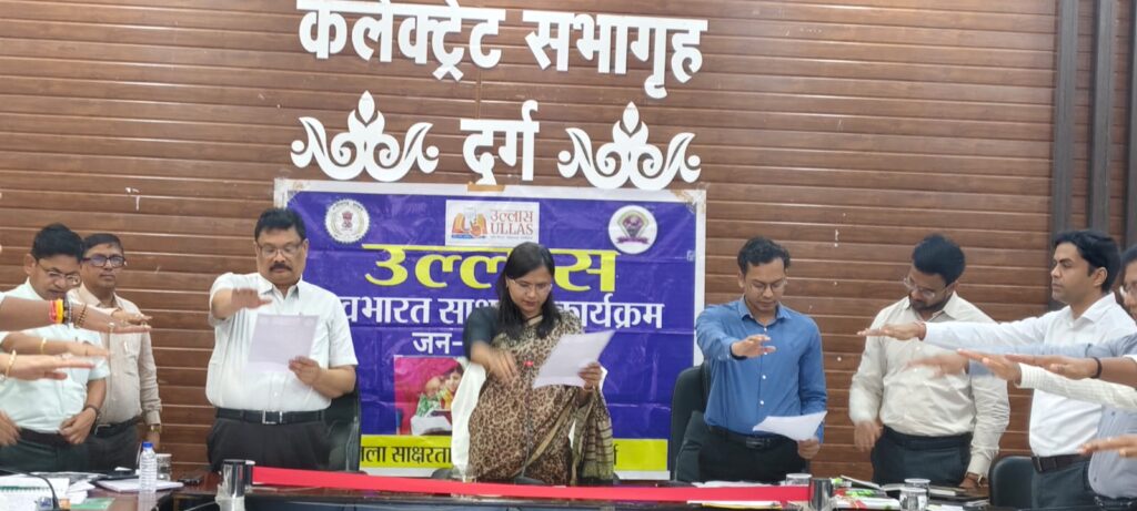 आज कलेक्टर सुश्री चौधरी ने समस्त विभाग के जिला अधिकारियों को उल्लास की शपथ दिलाई। साक्षरता सप्ताह अंतर्गत प्रतिदिन विभिन्न गतिविधियां जैसे जागरूकता रैली, उल्लास शपथ, नुक्कड़ नाटक, शैक्षणिक संस्थानों में विभिन्न प्रतियोगिताओं आदि का आयोजन किया जा रहा है।