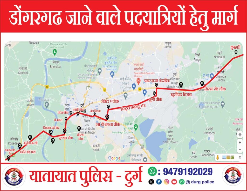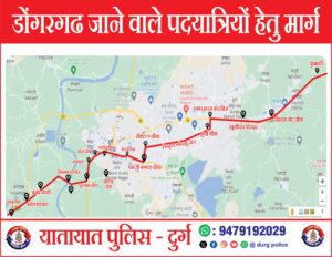 दुर्ग पुलिस अधीक्षक जितेन्द्र शुक्ला के द्वारा दर्शन के लिए डोगरगढ़ जाने वाले पदयात्रियों एवं वाहन चालको के सुरक्षित आवागमन के लिए दिये गये निर्देश पर सुश्री ऋचा मिश्रा, अतिरिक्त पुलिस अधीक्षक (यातायात) एवं श्री सतीष ठाकुर, श्री सदानंद विध्यराज, उप पुलिस अधीक्षक( यातायात) के नेतृत्व में दुर्ग पुलिस द्वारा कुम्हारी से अंजोरा बाईपास तक सुरक्षित कोरिडोर बनाकर रूट निर्धारित किये गये है।