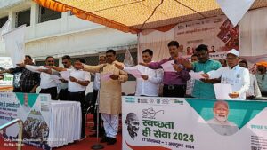 नगर पालिक निगम द्वारा आयोजित स्वच्छता ही सेवा कार्यक्रम का आयोजन दुर्ग के सुराना कॉलेज ग्राउंड में मंगलवार को आयोजित किया गया जिसमें विधायक गजेंद्र यादव,महापौर धीरजबाकलीवाल, आयुक्त लोकेश चन्द्राकर,स्वास्थ्य अधिकारी धर्मेंद्र मिश्रा एवं प्रधानाध्यापक द्वारा स्कूली बच्चों के साथ अभिभावकों को स्वच्छता की शपथ दिलाई गई।