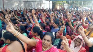 TheCityReport@durg. शासकीय योजनाओं को समाज के अंतिम व्यक्ति तक पहुंचाने में अहम भूमिका निभाने वाली आंगनबाड़ी कार्यकर्ता सहायिका संघ पिछले लंबे समय से अपनी 6 सूत्री मांगों को लेकर आंदोलनरत हैं इसी की कड़ी में सोमवार को अपने तीसरे चरण के आंदोलन में दुर्ग संभाग आयुक्त के दफ्तर के सामने आंगनबाड़ी कार्यकर्ता सहायिका संयुक्त मंच ने एक दिवसीय धरना प्रदर्शन कर प्रदेश कि कांग्रेस सरकार पर निशाना साधा साथ ही अपनी मांग को लेकर आगामी चुनाव में अगनबाडियो महिलाओं कि ताकत दिखाने कि चेतवानी भी दी