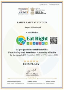 ऑडिट:- भारतीय खाद्य सुरक्षा एवं मानक प्राधिकरण (FSSAI) के द्वारा मान्यता प्राप्त ऑडिट संस्था द्वारा बिलासपुर, रायपुर एवं दुर्ग स्टेशनो को ऑडिट के चरणों से गुजरकर ईट राईट स्टेशन (Eat Right Station) से प्रमाणित हुआ है ।