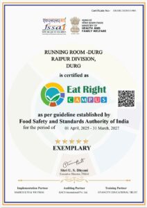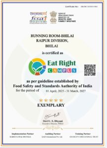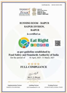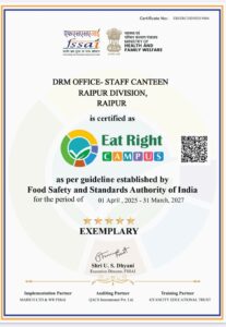दक्षिण पूर्व मध्य रेलवे के रायपुर मंडल को भारतीय खाद्य सुरक्षा एवं मानक प्राधिकरण (FSSAI) द्वारा “ईट राइट कैंपस” (Eat Right Campus) का खिताब प्रदान किया गया है। यह उपलब्धि स्वास्थ्य, स्वच्छता और खाद्य सुरक्षा के उच्चतम मानकों को अपनाने का प्रमाण है।