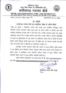 परीक्षा परिणाम परीक्षार्थीगण छ.ग.मदरसा बोर्ड की वेब साइट www.cgmadarsaboard.in तथा लिंक https://cgmbresult.cgmadarsaboard.in/page/result पर देख सकते हैं।