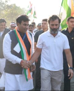 रविवार को मध्यप्रदेश में मोटक्का (खरगोन) से महू के बीच राहुल गांधी के साथ पदयात्रा करते हुए महापौर धीरज बाकलीवाल
