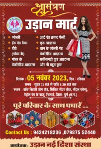 यह 5 नवम्बर रविवार को सुबह 11 बजे से शुरू होगा। संस्था अध्यक्ष निधि चन्द्राकर ने बताया कि उड़ान नई दिशा संस्था महिलाओं को आत्मनिर्भर बनाने के लिए हमेशा से कोशिश करती आई है उनको प्रशिक्षण देना तथा उनके बनाए गए प्रोडक्ट को बेहतर मार्केट की कोशिश हमेशा से रही है।