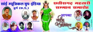 साई म्यूजिकल ग्रुप इंडिया के संचालक हाजी मिर्जा साजिद बेग ने जानकारी देते हुए बताया कि उक्त समारोह के मुख्य अतिथि दुर्ग लोकसभा सांसद श्री विजय बघेल जी थे किन्ही दुखद समाचार के कारण उनकी अनुपस्थिति में कार्यक्रम के मुख्य अतिथि मैत्री बाग के प्रबंधक डॉक्टर नवीन जैन जी एवं कार्यक्रम की अध्यक्षता श्री मुकुंद साव जी डायरेक्टर बी एम कालेज दुर्ग एवम विशेष अतिथि श्री मेंहदी भाई क्वालिटी मसाले ने विभिन्न व्यवसाय समाजसेवा शिक्षा कला के क्षेत्र में अहम योगदान देने वाली नारी शक्तियों का छत्तीसगढ़ महतारी सम्मान किया गया साथ ही शहर के कुछ चुनिंदा गणमान्य नागरिकों जिनकी इन क्षेत्रों में उपलब्धियां है उनको भी इस मंच से सम्मानित किया गया।