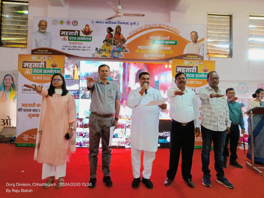 छत्तीसगढ़ में आज आयोजित महतारी वंदन सम्मेलन कार्यक्रम में प्रधानमंत्री श्री नरेन्द्र मोदी ने वर्चुअली जुड़कर छत्तीसगढ़ की महत्वाकांक्षी योजना महतारी वंदन योजना की शुरूआत की। प्रधानमंत्री द्वारा योजना के 70 लाख 12 हजार 800 पात्र हितग्राही आवेदकों को 655 करोड़ 57 लाख रूपए की राशि डीबीटी के माध्यम से बटन दबाकर अंतरित की गई। इस योजना के तहत अब छत्तीसगढ़ में विवाहित माताओं बहनों को प्रतिमाह 1 हजार रूपए और प्रतिवर्ष 12 हजार रूपए मिलेंगे। योजना से दुर्ग जिले के 4 लाख 5 हजार 319 महिला हितग्राही लाभांवित होंगे। जिला मुख्यालय दुर्ग के विवेकानंद सभागार पदमनाभपुर में विधायक श्री गजेन्द्र यादव के मुख्य आतिथ्य में जिला स्तरीय महतारी वंदन सम्मेलन आज सम्पन्न हुआ। सम्मेलन में संभागआयुक्त श्री एसएन राठौर, कलेक्टर सुश्री ऋचा प्रकाश चौधरी, जिला पंचायत के सीईओ श्री अश्वनी देवांगन, नगर निगम के महापौर श्री धीरज बाकलीवाल एवं अन्य पदाधिकारी गण सम्मिलित हुए।