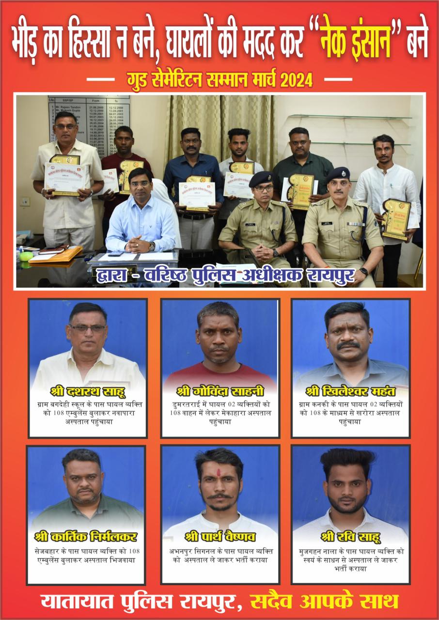 सड़क दुर्घटनाओं की रोकथाम एवं घायलों को त्वरित उपचार हेतु माननीय उच्चतम न्यायालय द्वारा सड़क दुर्घटना में घायलों को त्वरित चिकित्सा उपलब्ध कराने वाले व्यक्तियों को गुड सेमेरिटंस अर्थात नेक व्यक्ति की संज्ञा देते हुए इन्हे प्रोत्साहित व पुरस्कृत करने को निर्देशित किया गया है। इसी क्रम में वरिष्ठ पुलिस अधीक्षक जिला रायपुर श्री संतोष कुमार सिंह सड़क दुर्घटना में घायलों को त्वरित सहायता पहुचा कर जान बचाने वाले 06 गुड सेमेरिटंस को कंट्रोल रूम में सम्मानित किया गया। इस दौरान अतिरिक्त पुलिस अधीक्षक यातायात/प्रोटोकाल श्री अनुराग झा एवं उप पुलिस अधीक्षक यातायात रायपुर श्री गुरजीत सिंह उपस्थित रहे।