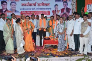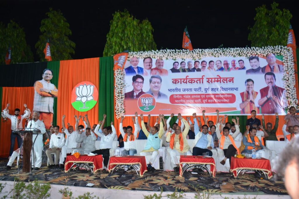 दुर्ग शहर विधानसभा स्तरीय विशाल कार्यकर्ता सम्मेलन बाफना मंगलम दुर्ग में सम्पन्न हुआ। कार्यक्रम के मुख्य अतिथि वित्तमंत्री ओ. पी. चौधरी ने कहा की चौकीदार के हाथ में देश सुरक्षित है और नित नये कीर्तिमान गढ़ रहा है। ये मोदी जी की गारंटी है, तीसरे कार्यकाल में देश की अर्थव्यवस्था को 3 नंबर पर लाएंगे। तरह तरह घोटालेबाज भूपेश ईडी के शिकंजे में है। 500 साल टेंट से प्रभु श्री राम को भव्य मंदिर तक बीजेपी ने ही लाया है। देश बदल रहा है, आगामी चुनाव में आप भी भाजपा को वोट कर राष्ट्र निर्माण में अपनी भूमिका निभाए।