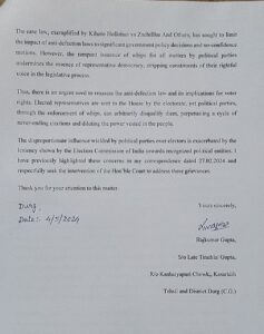 छत्तीसगढ़ स्वाभिमान मंच के राष्ट्रीय अध्यक्ष राजकुमार गुप्त ने सुप्रीम कोर्ट के चीफ जस्टिस को पत्र लिखकर उनका ध्यान लोकतंत्र और संविधान पर आसन्न खतरे की ओर आकर्षित करते हुए कहा है कि भारत निर्वाचन आयोग के सहयोग से राष्ट्रीय और राज्य स्तरीय मान्यता प्राप्त राजनीतिक दल देश में पार्टी की तानाशाही स्थापित करने का प्रयास कर रहे हैं और इसके लिए व्हीप और दलबदल कानून को राजनीतिक टूल के रूप में इस्तेमाल करते हैं।