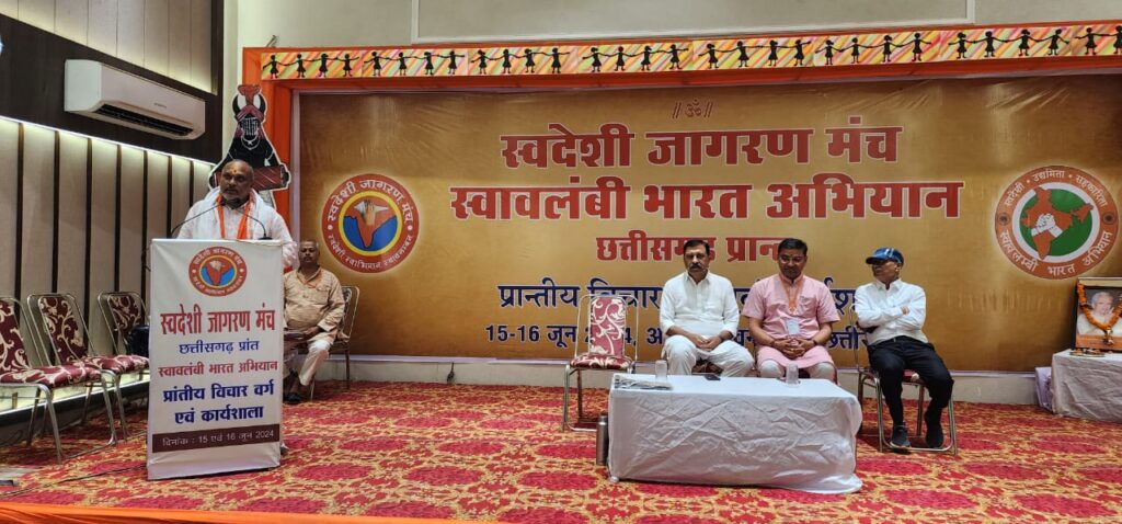 अग्रसेन भवन में आयोजित स्वदेशी जागरण मंच छत्तीसगढ़ प्रांत स्वालंबी भारत आभियान प्रांतीय विचार वर्ग एवम कार्यशाला कार्यक्रम में दुर्ग ग्रामीण विधायक ललित चंद्राकर शामिल होकर इस कार्यक्रम के लिए हार्दिक शुभकामनाएं प्रेषित किया और लोगो को स्वदेश निर्मित वास्तुवो के उपयोग के लिए लोगों को प्रेरित किया।इस अवसर पर विधायक श्री ललित चंद्राकर ने कहा कि स्वावलंबी भारत अभियान ‘स्व’ की भावना पर आधारित सराहनीय पहल कौशल अर्जित करके न केवल रोजगार प्राप्त किया जा सकता है बल्कि यह स्वयं को जीवंत और ऊर्जावान महसूस करने का माध्यम भी है।